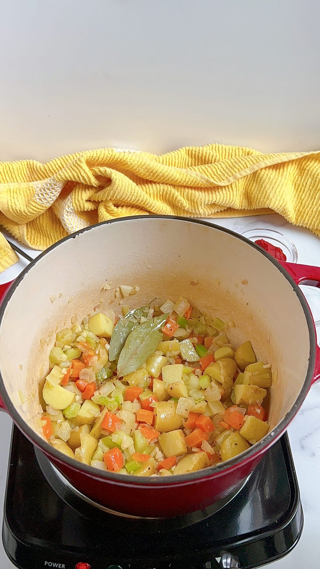 In a med-large quart pot or dutch oven, over medium heat, melt butter. Then add potato, onion, carrots, and celery and cook for 4-5 minutes. Next add shallots and garlic. Season with salt and pepper and Old Bay, and cook for an additional 2-3 minutes.