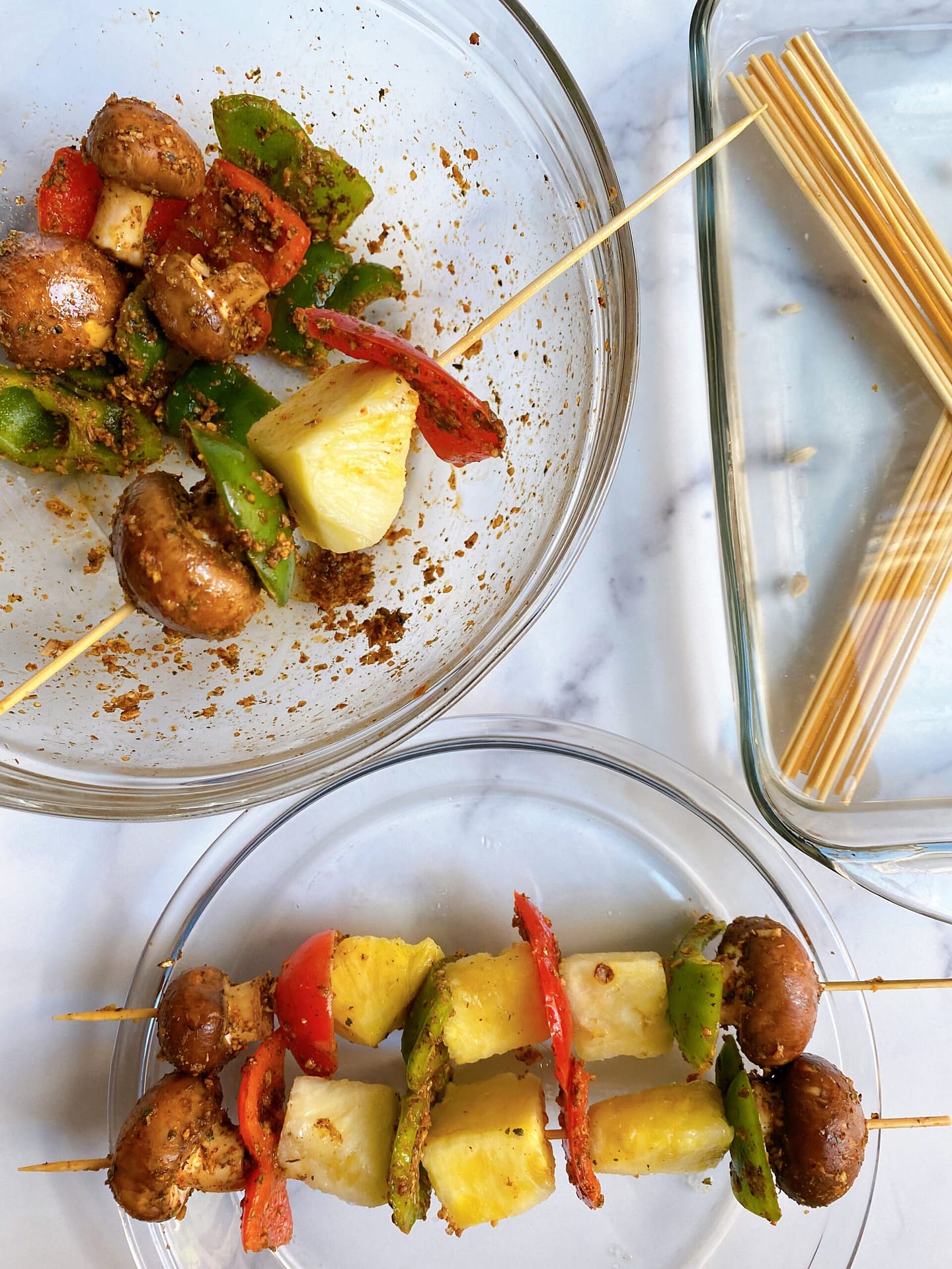 - How you place the salmon, veggies, and pineapple on the skewer matters. Each piece should touch but not be jammed together. Prevent overcooking and get juicier, tender kebabs by making them just close enough without overloading the skewer.